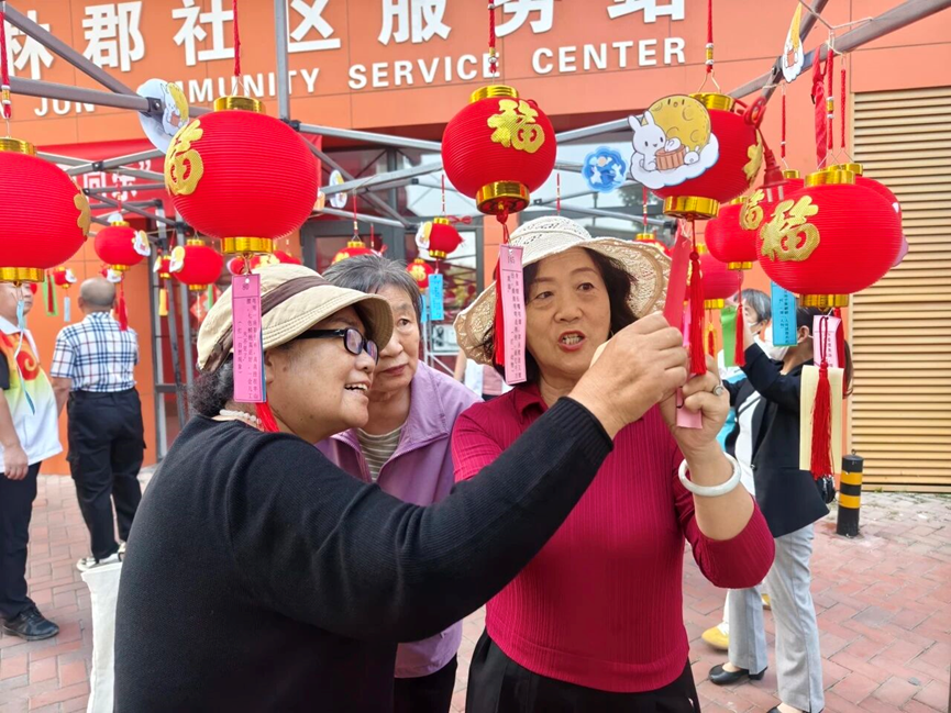 伊林郡社区一年一度的中秋节猜灯谜活动拉开帷幕。每盏灯下都悬着一张写有谜题的彩色纸条,随风轻轻摇曳。参加活动的居民们兴致勃勃地穿梭在灯笼之间。有人仰头凝思,有人低头探讨寻找着自己的谜题答案。社区工作人员们热情的维持着秩序,整个社区沉浸在欢声笑语中,浓浓的节日氛围和邻里温情在节日的氛围下蔓延开来。品月饼环节,在香气四溢的长桌上整齐摆放着豆沙、五仁等口味的月饼。居民们围在一起,边品尝边交流各自最爱的口味。孩子们捧着小巧的月饼,脸上沾满了酥皮;老人们则慢慢咀嚼,回味着儿时的味道。大家分享着月饼,同时也分享着节日的喜悦,温馨的气氛感染着在场的每一个人。月饼盘旁边整齐摆放着茶杯与冲泡好的菊花茶,茶香袅袅散开。大家捧着温热的茶杯小口啜饮,清甜的茶香混着欢声笑语,为中秋增添了一份清爽雅致的暖意。