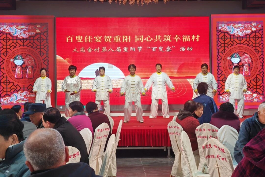 自2018年起,房山区窦店镇大高舍村的重阳节百叟宴已陪伴老人们走过八载春秋,活动持续2-3天,文艺演出由村民自编自导自演,慷慨激昂的大合唱、灵动的舞蹈,还有原创相声,一个个精彩节目轮番上演,现场掌声与叫好声不断。