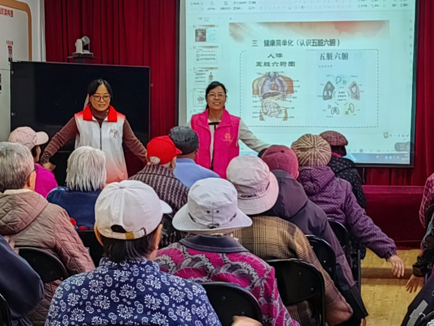 不同于传统讲座的单向宣讲,两位健康志愿者以“理论+实践”的模式展开。她们先系统讲解拍打调理的健康理念,再聚焦老年人日常需求,细化拆解拍打姿势、力度控制、部位适配等实操要点,同步强调注意事项。随后转入“现场带操”环节,志愿者逐节分解拍打动作,手把手指导细节,让抽象的养生知识变成可触摸、可模仿的具体动作。