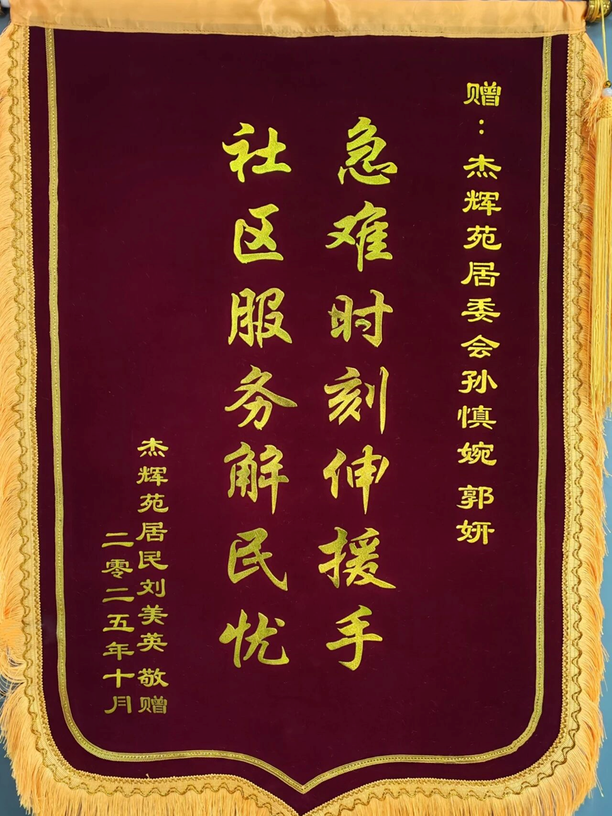 10月23日上午,受助居民王女士专程来到杰辉苑社区居委会,将一面写有“急难时刻伸援手,社区服务解民忧”的锦旗送到孙慎婉、郭妍手中,对社区工作人员在危急时刻挺身而出、高效务实的救助行为表达由衷感谢。此次救助不仅彰显了社区工作人员“急居民之所急、解居民之所难”的服务宗旨,更用实际行动诠释了基层工作者的责任与担当,进一步拉近了社区与居民之间的距离。杰辉苑社区将持续加强工作人员培训,完善应急机制,为居民提供更贴心、更安全的居住环境。