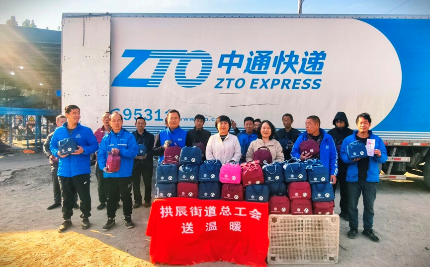 此次慰问对象是拱辰街道辖区内80余名中通快递员,首先为大家详细介绍了工会组织与服务项目,随后为大家发放了精心准备的温暖包。温暖包里装有保温杯、充电暖手宝、帽子、手套等防寒物资。