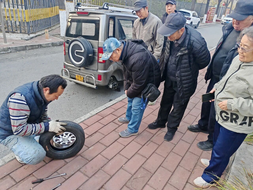 与此同时,社区工作人员安抚穆师傅。不一会儿维修师傅就带着工具和备用轮胎来了,只看师傅手速干净利索检查出漏气原因,给穆师傅解释无法维修的地方,经过穆师傅同意,维修师傅又技术熟练的拆解螺丝和轮毂,不到十五分钟就换好了备用胎,穆师傅一边激动的感谢师傅,一边又向李阿姨表示感谢帮忙。