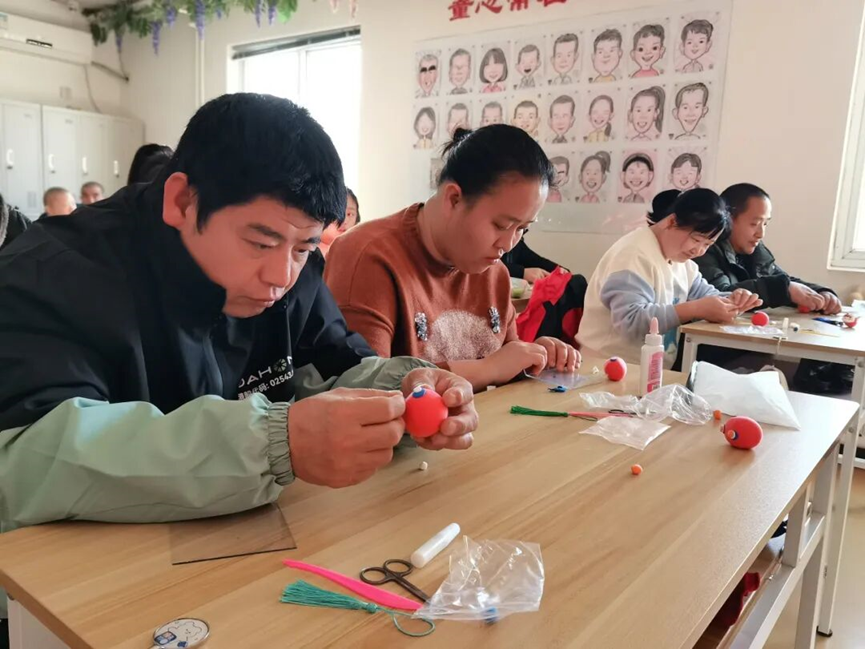 考虑到职康学员的操作特点,潘静老师将制作流程拆解为“揉泥塑形→五官刻画→色彩搭配→流苏组装”四步,每一个环节都提供针对性指导。揉泥时强调力度均匀,确保狮头紧实不易变形;刻画五官时用小工具辅助勾勒,还提前备好配色彩泥,降低创作难度;组装流苏环节更是手把手协助,确保学员能顺利将流苏穿过狮头预留孔,既固定牢固又不影响自然摆动。细致入微的教学,让每位学员都能跟上节奏、大胆创作。