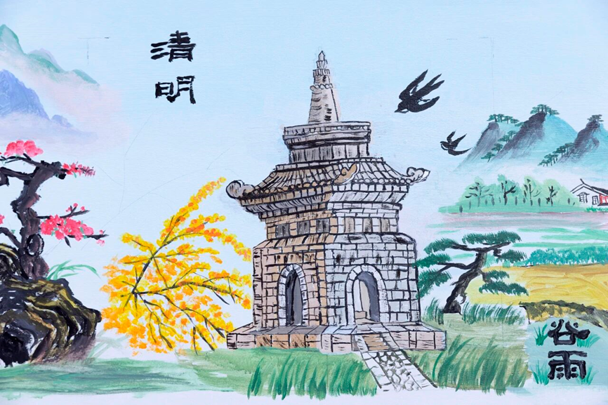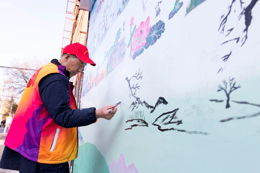 这处惊艳蜕变,源自社区志愿者郑明春的妙手丹青!郑师傅以斑驳墙面为画布、以五彩画笔为媒介,将二十四节气的时序流转与燕山四季的灵秀风华巧然相融,让寻常老墙绽放别样生机。