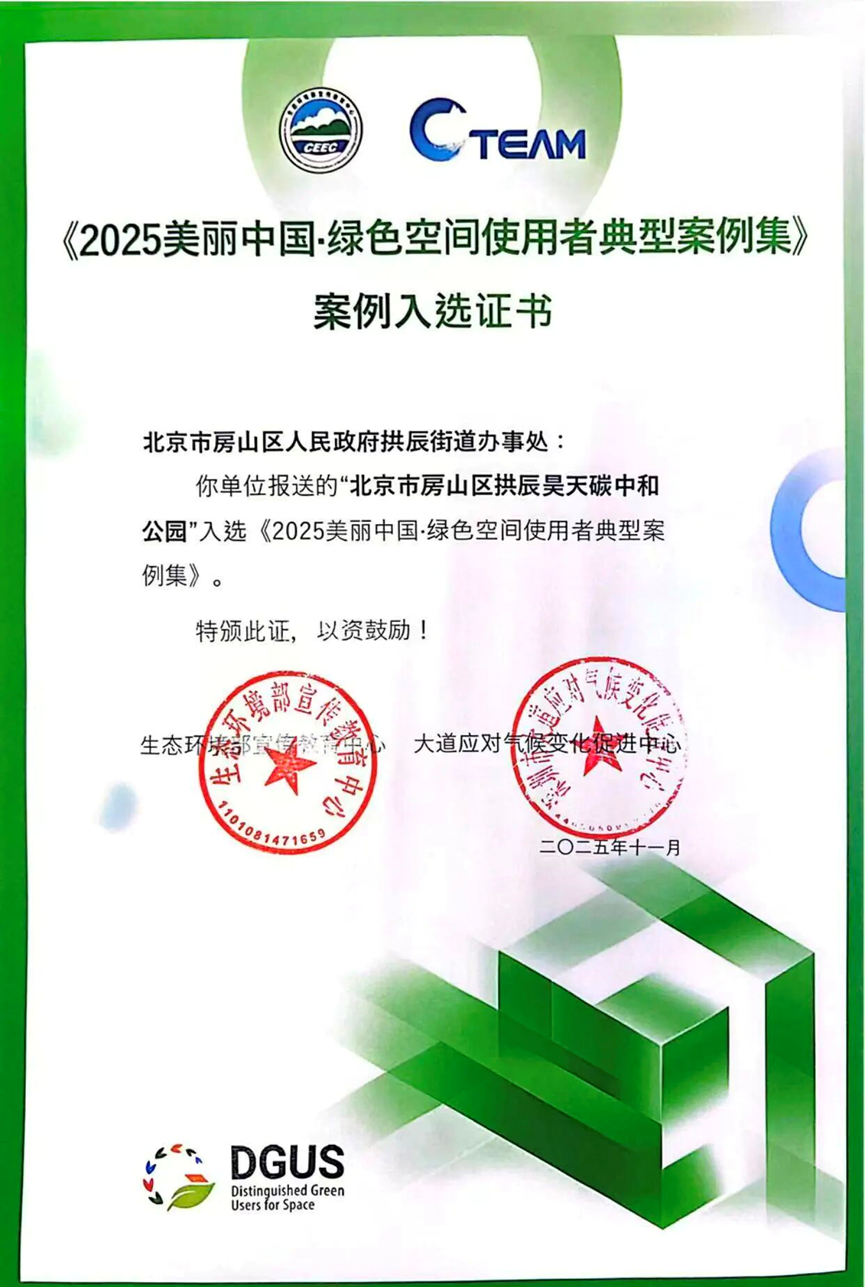 喜报!房山区昊天碳中和公园凭借出色的低碳实践,成功入选《2025美丽中国·绿色空间使用者典型案例集》。这一国家级荣誉,标志着昊天碳中和公园的创新模式已成为全国绿色空间建设的示范样板。