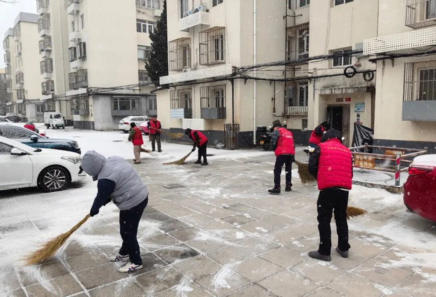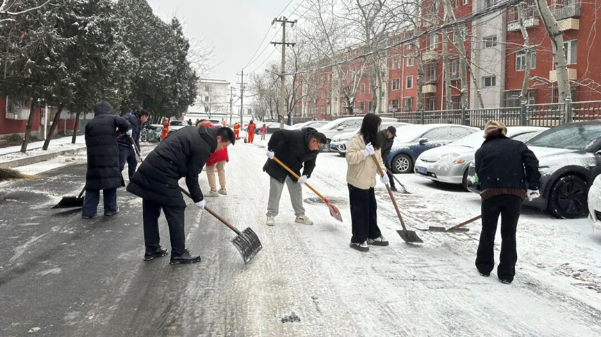 工作人员手持铁锹、雪铲、扫帚等工具,物业出动铲雪车、清理车,对主干道路、交叉路口、背街小巷、方砖步道、坡道台阶、公交车站等重点区域进行破冰除雪,分工协作、有序配合,全力做到“随下随清、雪停路净”。街道还特别关注老年人和特殊群体的出行安全,组织人员帮助清扫门前积雪,同时通过公众号、居民微信群等多种方式,及时发布天气预警和安全提示,提醒居民雪天路滑,注意出行安全。