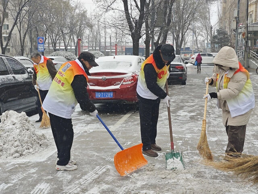 街道退役军人服务站组织志愿服务队开展扫雪铲冰志愿行动,志愿者们响应号召,及时清扫主干道、社区出入口等重点区域积雪,并对独居老人等群体开展“敲门行动”,帮助清理门前积雪,以实际行动践行“退役不褪色”的担当。街道团工委组织机关团员、社区青年及辖区志愿者组建“青春扫雪突击队”,投身扫雪一线。队伍重点清理主干道、公交站台及社区便道,并主动为独居老人清扫门前积雪。志愿者们分工协作,在清扫同时积极开展安全宣传,用实际行动守护居民出行安全。
