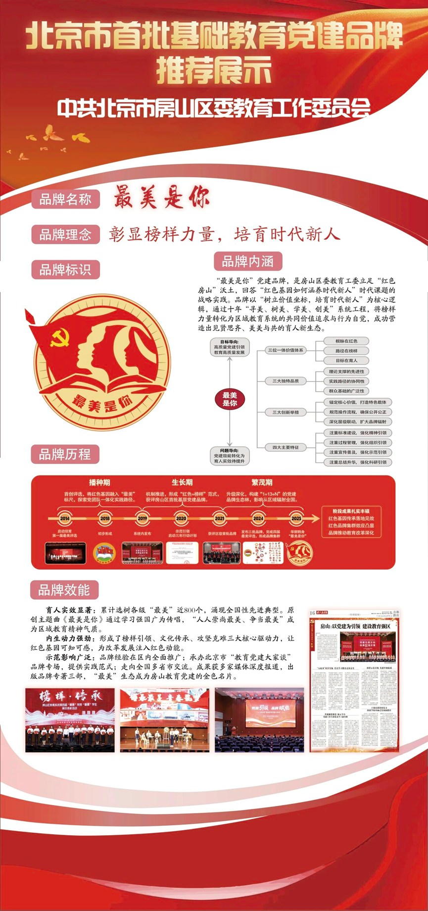 作为房山教育党建品牌建设工作的示范龙头,“最美是你”品牌建设始于2014年启动的“寻找龙乡最美的你”特色创新活动。11年来,品牌历经“寻找龙乡最美的你——榜样示范引领工作法”“榜样示范引领工程”到“最美是你”三个发展阶段,完成了持续升级与深化。通过“最美党员”“最美学生”“选、树、学、做”系统工程,品牌立足红色房山沃土,将社会主义核心价值观具象化,实现红色魂脉与价值坐标的深度融合,让榜样之“光”照亮育人之路,已从个体闪光点升华为房山师生的集体精神标识,为房山教育高质量发展注入强大内生动力。