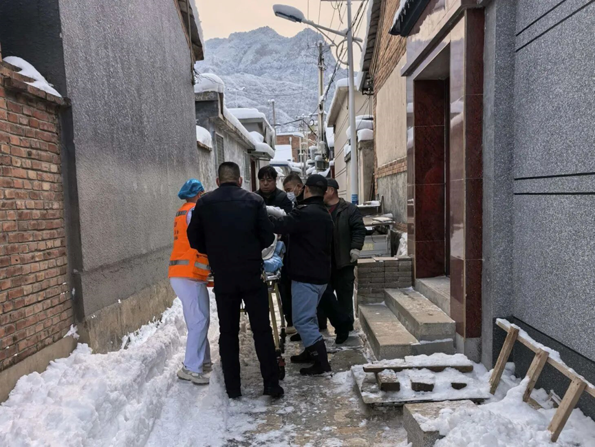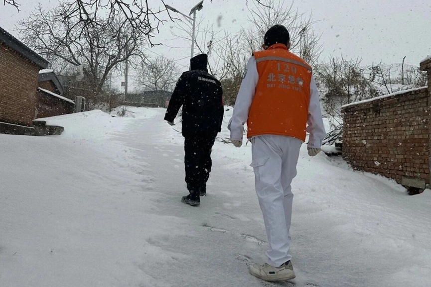 次日,风雪未歇,救援仍在继续。18日清晨,韩村河镇二龙岗村一名53岁男性突发胃痛、憋气症状。由于患者独居且住址位于陡坡之上,救护车无法直达患者家门口。韩村河镇120急救站医生刘海龙、护士续连雪、司机郭静和担架工王文全,毅然徒步踏雪上山。经评估排除心脏急症,判断为饮酒后胃溃疡发作。尽管患者尚可行走,但考虑到路况险峻,团队全程搀扶,一步步护送其下山,确保安全转运。