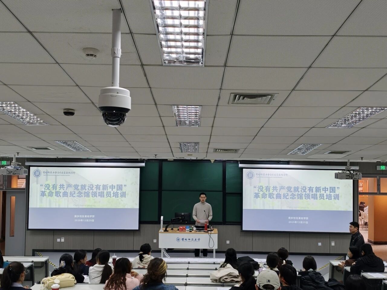 近日,一场别开生面的“革命歌曲领唱员”专项培训在首都师范大学良乡校区温情启幕,70余名大学生怀揣热忱齐聚一堂,沉浸式解锁红色歌曲的精神密码与演唱技巧。“这不仅是一段旋律,更是烽火岁月里人民的心声,是曹火星先生以笔为刃镌刻的信仰宣言。”纪念馆负责人以歌曲诞生史为引,深情回溯1943年曹火星扎根平西根据地、借油灯微光创作的历程,从“没有共产党就没有中国”到“新中国”的一字之变,让青年读懂红色旋律背后跨越时空的真理力量。