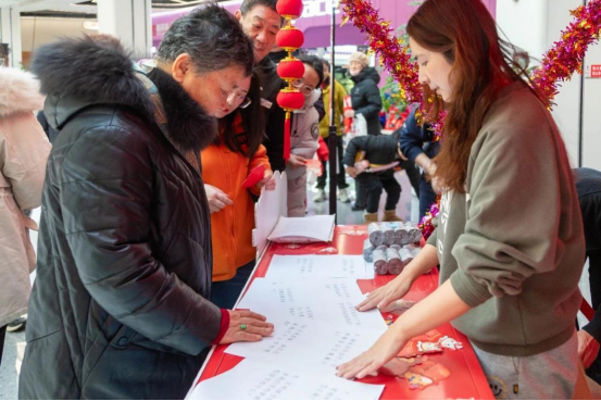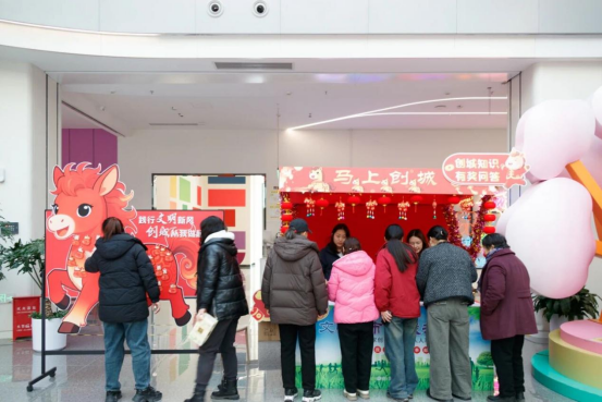 活动现场张灯结彩,处处洋溢着浓浓的年味,吸引了众多居民踊跃参与。在趣味答题区域,居民们有序排队,随机抽取题号参与答题。题目设计紧密围绕创城核心知识,涵盖文明行为规范、环境卫生要求、公共服务常识等多个方面。居民们认真思考、踊跃作答,工作人员则对相关问题进行了专业的解答,帮助他们更好地掌握和理解创城知识。本次活动共吸引约200名居民参加。