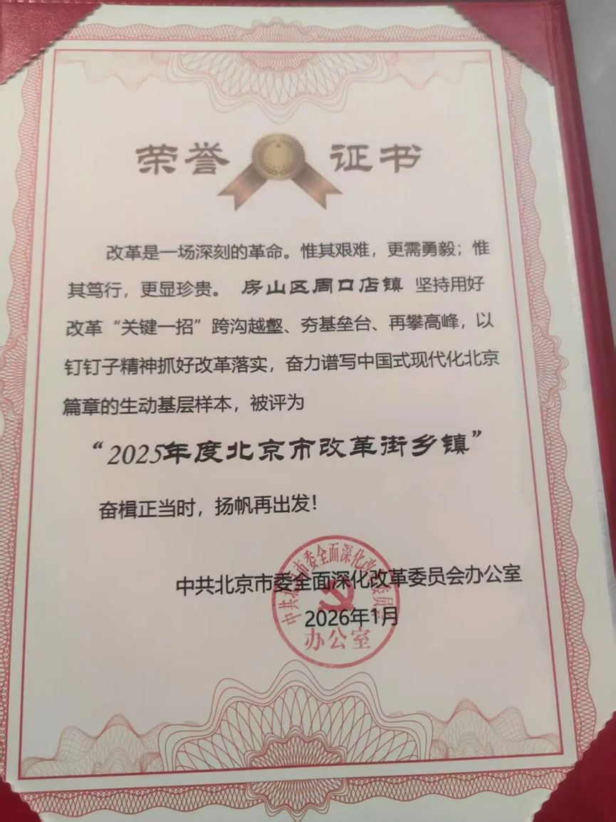 近日,中共北京市委全面深化改革委员会办公室正式发布2025年度改革街乡镇评选结果,周口店镇成功入选,荣获“2025年度北京市改革街乡镇”荣誉称号! 这份荣誉,是对我镇锐意改革创新、推动地区高质量发展实践的充分肯定,更是对未来持续深化改革的激励与鞭策。