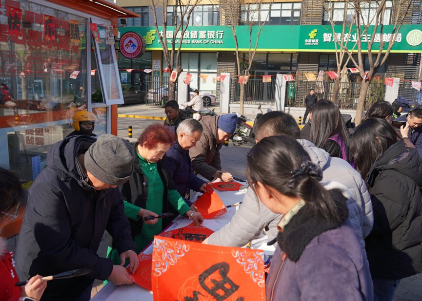 墨香四溢的送福区前也排起长队。社区邀请的书法爱好者现场挥毫,将美好的祝愿凝于笔端,一幅幅红火的“福”字和春联接连诞生。商户、业主与骑手们有序领取这份手写祝福,为即将到来的春节增添了浓厚的文化气息。