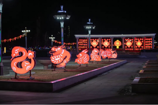 燕山文化广场,灯笼墙红火迎客,生肖剪影小品萌趣十足,氛围感拉满。