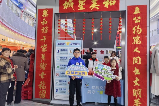 一旁的“星”民文明公约打卡区同样人气高涨。抬眼望去,一副对联格外醒目:上联“立公约万人同书文明卷”,下联“筑和谐千家共绘幸福图”,横批“和美星城”,寥寥数语勾勒出文明共建的美好愿景。