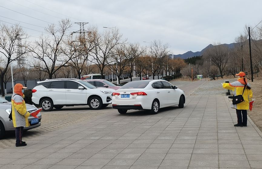 在燕怡园入口处,“柠檬黄”们引导机动车有序停放,提示父母照看好小孩,并为游园市民指引路线、提供服务。