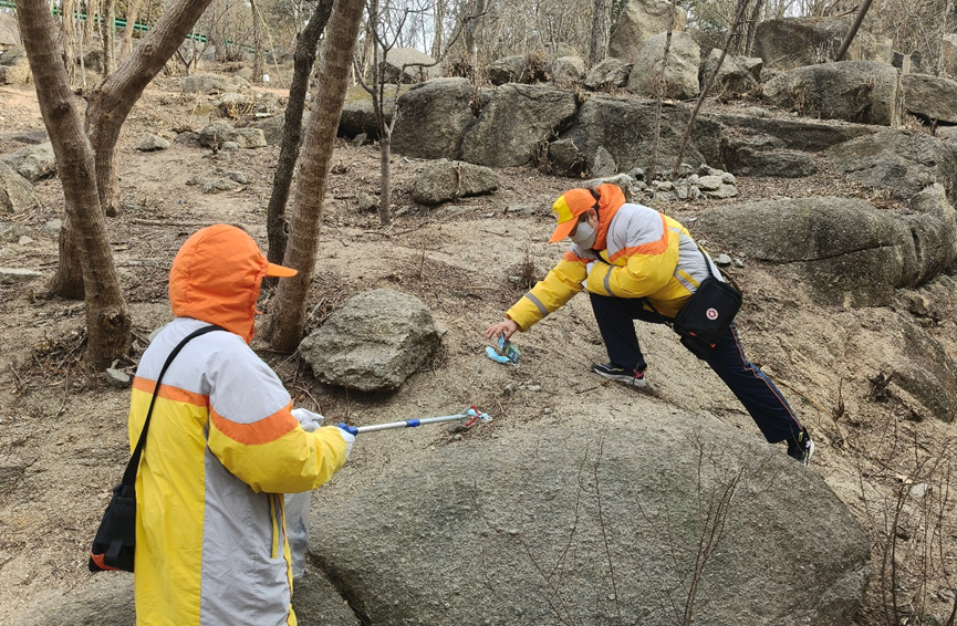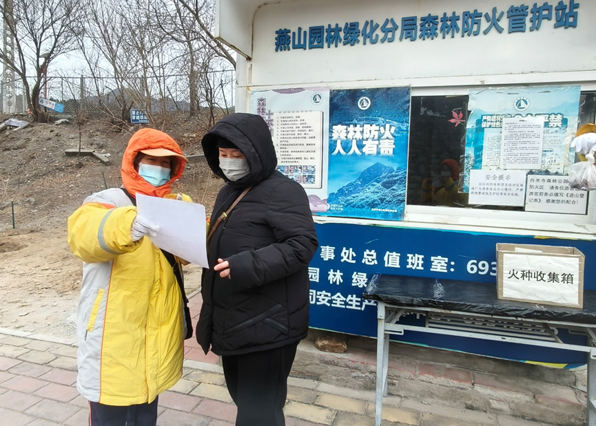 农历正月初一,燕山中队25名引导员兵分两路,分别到白水寺森林公园和燕怡园开展志愿服务。在白水寺公园,引导员们一边宣传森林防火的重要性,提示游人不要吸烟,一边捡拾游园市民遗落的垃圾。