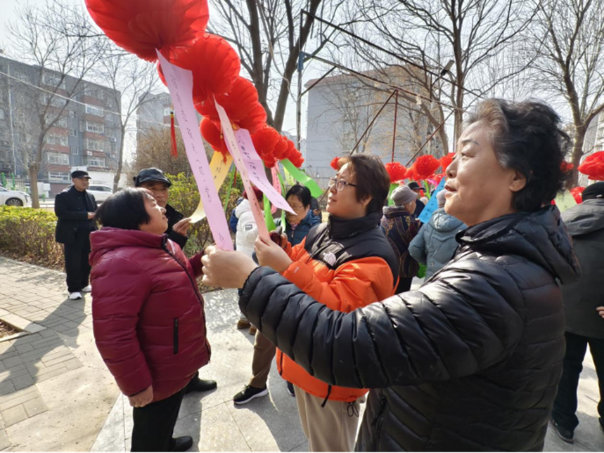3月3日下午,苏庄二里社区新时代文明实践站开展“浓浓邻里情·欢乐闹元宵”活动。活动设立在社内区小花园,现场悬挂了数十个大红灯笼,每个灯笼下都悬挂着写着谜面的纸条,居民们围聚在灯笼下,饶有兴致地猜灯谜,大家互相讨论、各抒己见,现场气氛十分活跃。