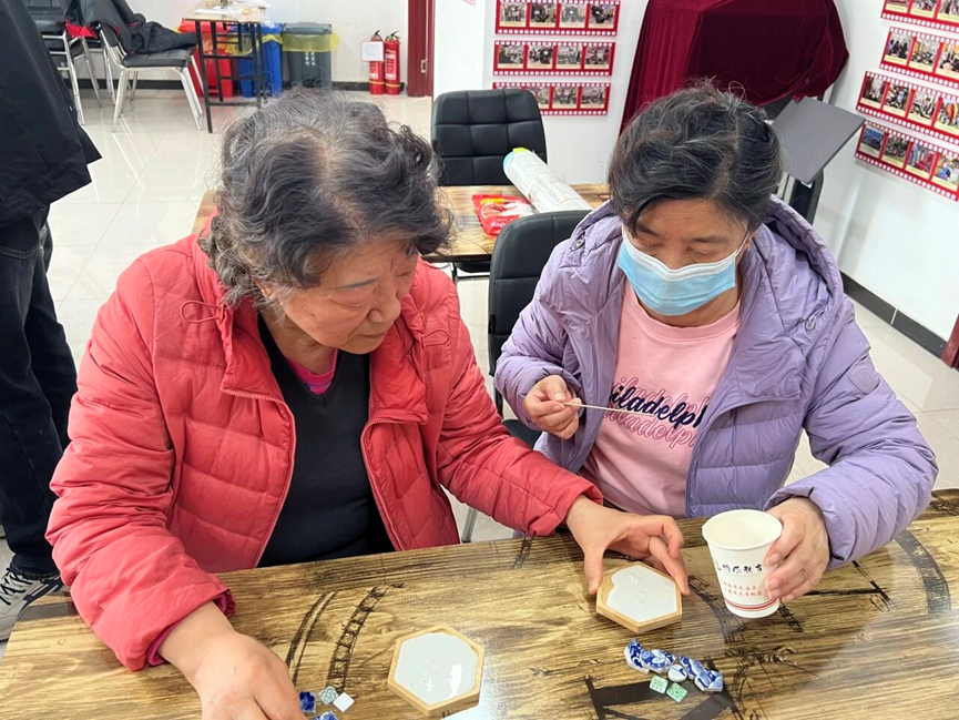 活动中,老师以“瓷中瑰宝”为题,向居民介绍了青花瓷的千年发展脉络,深入浅出地解析了“白地蓝花”的烧制原理,尤其是元代的铁锈斑、永宣的晕散效果以及清代康熙时期的“分水”技法,展现了古人对窑温与料性的精妙掌控,令在场居民叹为观止。随后,居民们动手体验制作环节。大家领取木托、石膏粉及青花瓷片,按照比例调和石膏浆倒入模具,趁湿嵌入瓷片。在等待凝固的过程中,居民们交流了对传统纹样的理解。