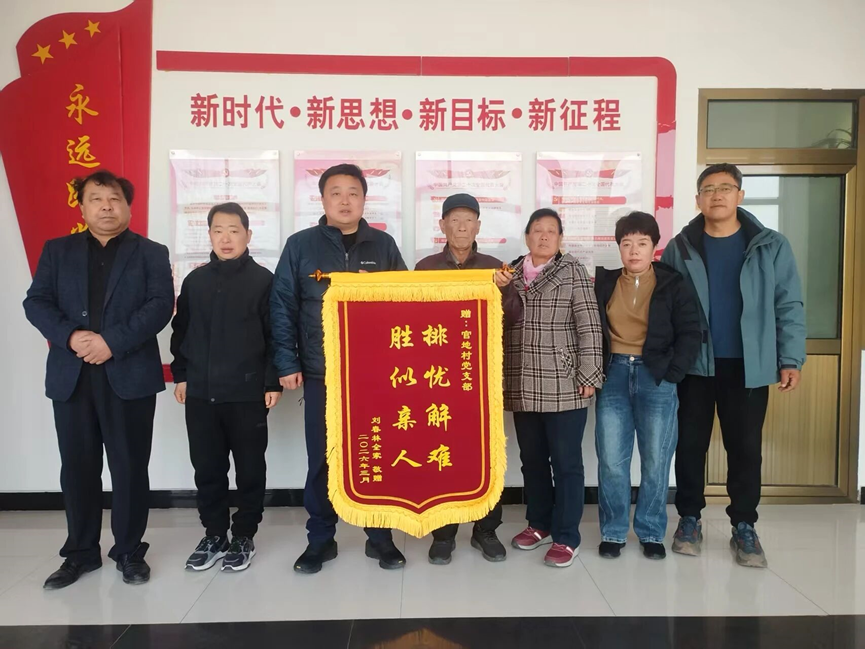 近日,周口店镇官地村内暖意融融。村民刘春林手持“排忧解难 胜似亲人”锦旗,紧握村“两委”干部双手连连致谢,淳朴的举动道出了对干部为民解忧的由衷感激。