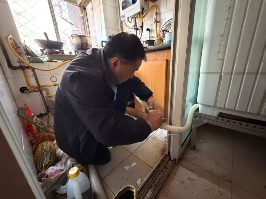 经过反复勘察房屋布局,服务团队提出将洗衣机与冰箱位置互换,从厨房接引上下水,采用定制管件连通排水系统,并加装带滚轮的可移动底座,既破解排水难题,又方便老人日常挪动与操作。为确保方案精准适配、安全实用,养老服务驿站工作人员多次上门测量沟通,逐项完善细节,顺利完成洗衣机移位、上下水改造和可移动底座安装。