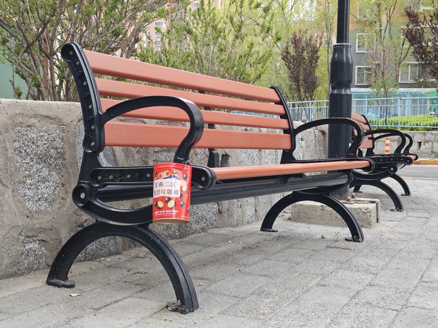 面对有桶仍乱扔的现象,工作人员换位思考:休闲时步行几十米投掷烟头存在不便,关键在于临时投放设施缺失。经过实地查看和走访调研,明确从满足居民临时投放需求入手,实现源头治理,补齐便民设施短板,引导居民主动规范投放,打破“治标不治本”的循环。基于这一思路,街道巧用闲置容器制作低成本、易布设的微型投放点。各社区积极发动居民捐赠闲置茶叶桶、废旧玻璃瓶、铁桶等,经过简单改造后,变身成悬挂式微型垃圾桶,精准布设于垃圾高发区域,固定在休闲桌腿、绿地围栏等便捷位置,真正实现“随手可投”。