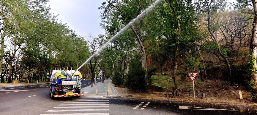安排洒水车对各街道树木开展高压喷淋作业,使飞絮湿润沉降,降低空中飘散量。