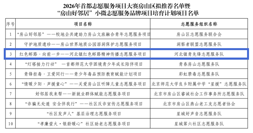 红色邮路・向前一步——河北镇红色邮路精神传播志愿服务项目,经团区委、区志联组织评审,被确定为2026年首都志愿服务项目大赛房山区拟推荐项目,同时入选2026年“房山好邻居”小微志愿服务品牌项目培育计划!