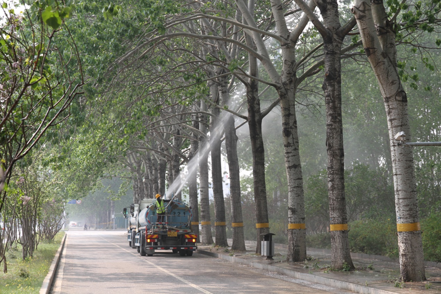 在重点区域防治上,房山区通过科学分析,精准锁定拱辰街道、西潞街道、长阳镇等人员密集区,以及京周路等交通干道和社区、学校、景区等重点区域,统筹制定治理方案。以西潞街道为例,根据当地飞絮树种分布和气候特点,合理安排湿化清扫作业时段,加强早晚高峰前及每日10:00—16:00雌株果序集中开裂时段的喷洒湿化,有效减少飞絮对居民生活的影响。