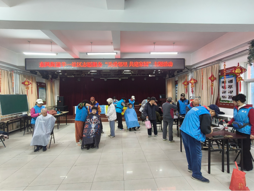 义诊台前,志愿者认真为居民测量血压,叮嘱日常健康注意事项;理发区内,理发师娴熟操作,与居民亲切交谈;磨刀摊位前,居民有序排队,废旧刀具重焕锋利。