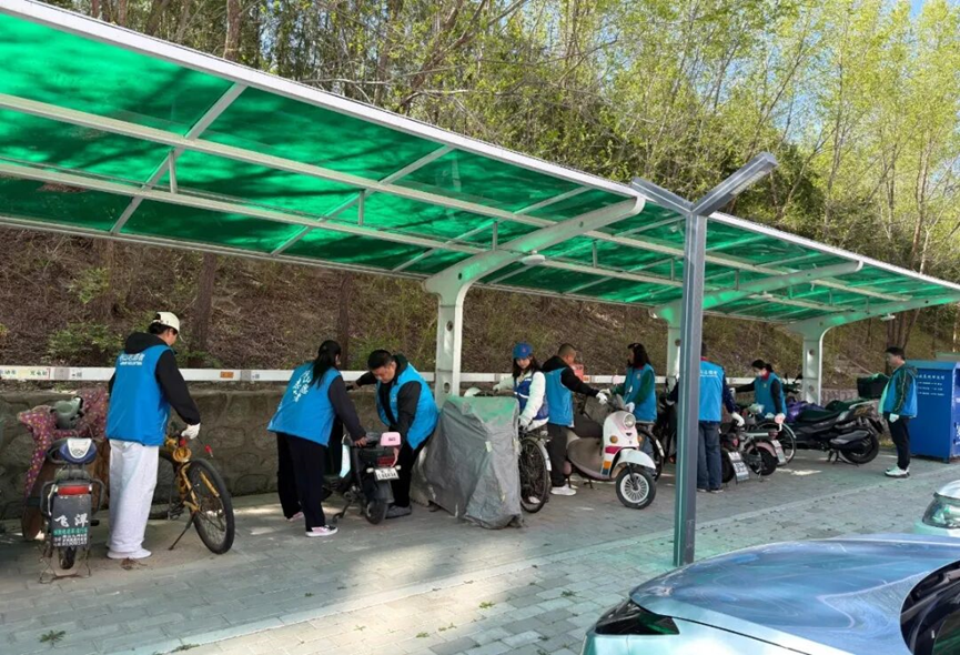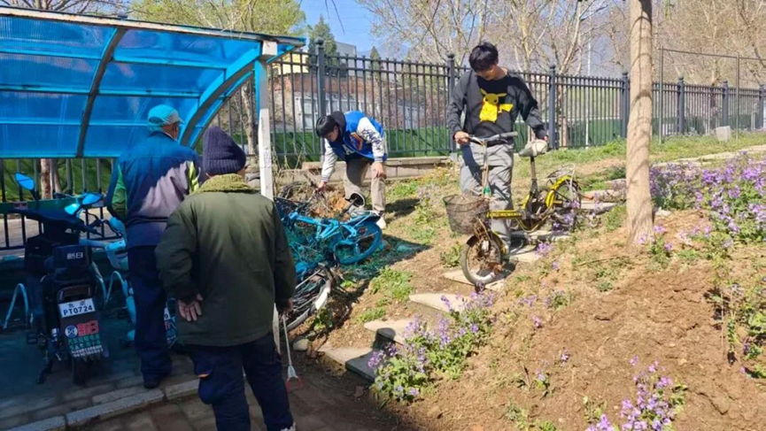 燕和园社区开展车棚清理与车辆规范摆放活动。大家分工协作、密切配合,对车棚内积存的灰尘、废弃杂物、垃圾进行彻底清扫,将原本乱停乱放的自行车、电动车逐一搬移、规整到位,引导按标识有序停放。