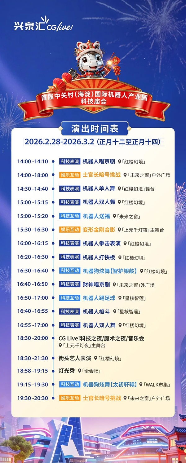 元宵佳节,灯火璀璨。2月27日至3月3日,首届中关村(海淀)国际机器人产业园科技庙会在海淀区温泉镇兴泉汇CG Live!火热举办。