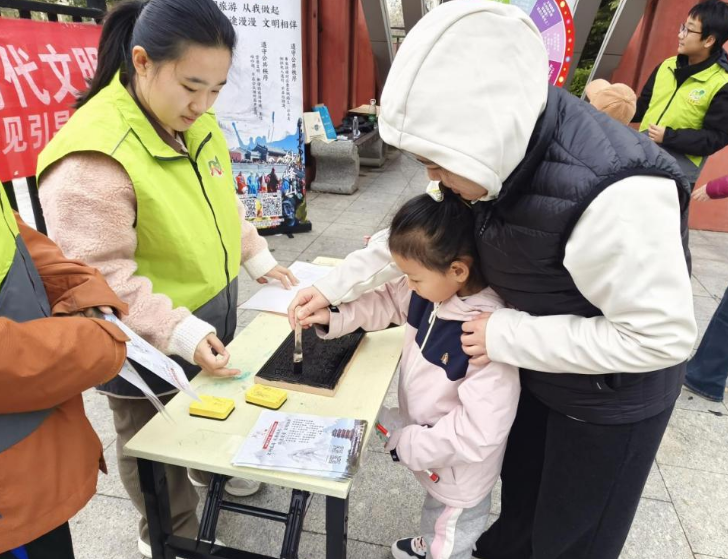 活动中,文明知识转盘引爆答题热潮,趣味互动实力圈粉。转盘轻轻转动,涵盖爱护环境、古迹保护、文明拍照等文明旅游主题题目20道随机呈现,通过趣味互动的形式使文明理念入脑入心。非遗体验区内,未成年人与家长手持传统拓印工具,在宣纸上精心拓印《文明旅游公约》,一锤一印间传承技艺、播撒文明的种子。