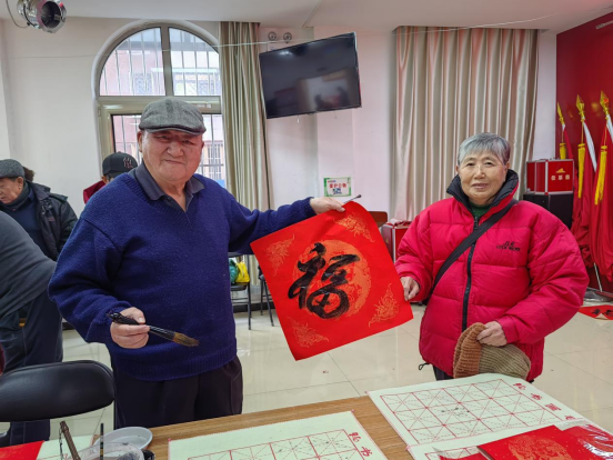 活动现场暖意融融,社区志愿者提前备好笔墨纸砚,邀请社区书法爱好者挥毫泼墨,一幅幅饱含美好寓意的“福”字、对联跃然纸上,笔锋遒劲有力,字里行间满是新春期许。志愿者边为居民递上福字,边讲解移风易俗知识,倡导大家摒弃陈规陋习,践行文明过节、勤俭节约、邻里和睦的文明新风尚,让传统节日与文明新风相融相通。