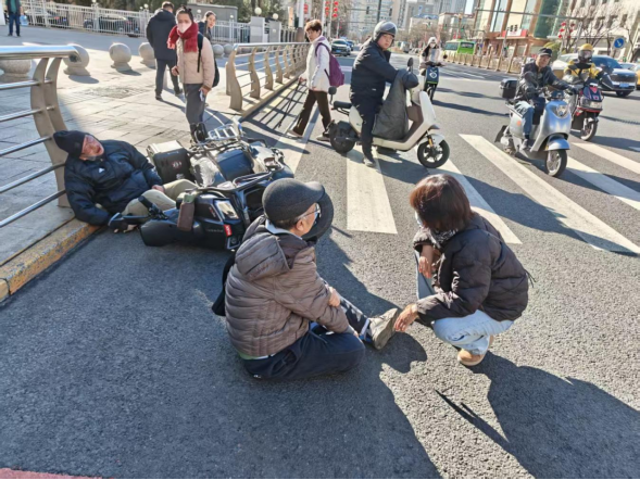 3月11日8时许,门头沟区大峪街道增产路东区社区干部罗世杰像往常一样奔赴工作岗位,途经区体育馆时,突遇一起紧急事件:一名老人瘫坐在地,双手微微颤抖,眼神中满是惊恐;另一名老人则侧卧在旁,面部渗血电动车横倒在身边,车轮还在空转,情况十分紧急。罗世杰立即上前查看,发现其中一名老人正是自己社区的居民,他马上跟社区干部孙永政、郭娜联系,叮嘱二人火速到现场,并抓紧联系老人家属。