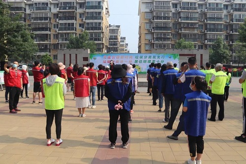 5月30日,在密云区世纪家园小区文化活动广场,宾阳西里社区开展主题为“党建引领新时尚 垃圾分类我先行”的周末清洁日活动,社区干部、物业工作人员、在职党员、楼组长、志愿者等70余人参加。