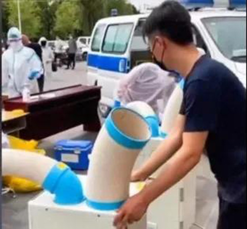 6月16日,北京密云区医护人员在溪翁庄镇户外对餐饮工作人员进行核酸检测,附近一家民宿的老板刘女士得知检测地点就在自己店附近,征得同意后安排员工拉来店里4台移动空调,为奋战在防疫一线的医护人员降温。