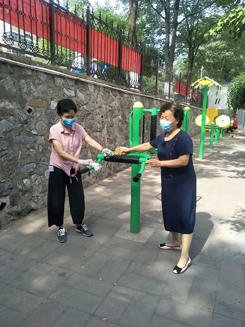 沿湖社区本月主题党日活动中,党员们手拿扫把、抹布分组展开活动,热火朝天地将健身广场的器材擦拭一新,将楼前屋后卫生死角清理干净,将绿地杂草落叶梳扫一空。并结合疫情防控,全面做好各楼门卡口的清洁消杀工作。