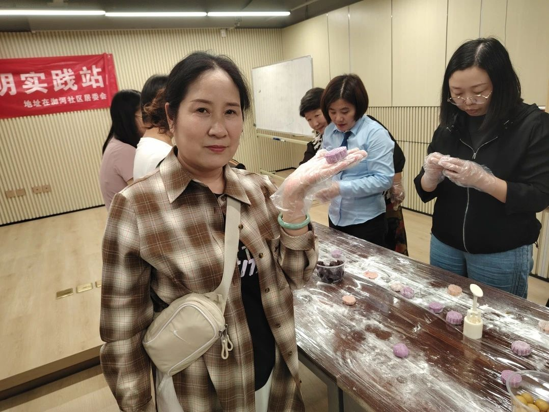 居民们围在一起,按照工作人员的讲解和示范,一步一步地揉面团、擀面皮、包馅……虽然大部分居民都是第一次尝试做冰皮月饼,但是大家兴趣十足,学得既认真,又仔细,月饼做得有模有样。看着自己亲手制作的冰皮月饼,居民们的喜悦之情溢于言表,大家纷纷拿出手机拍照留念,记录这一美好时刻。