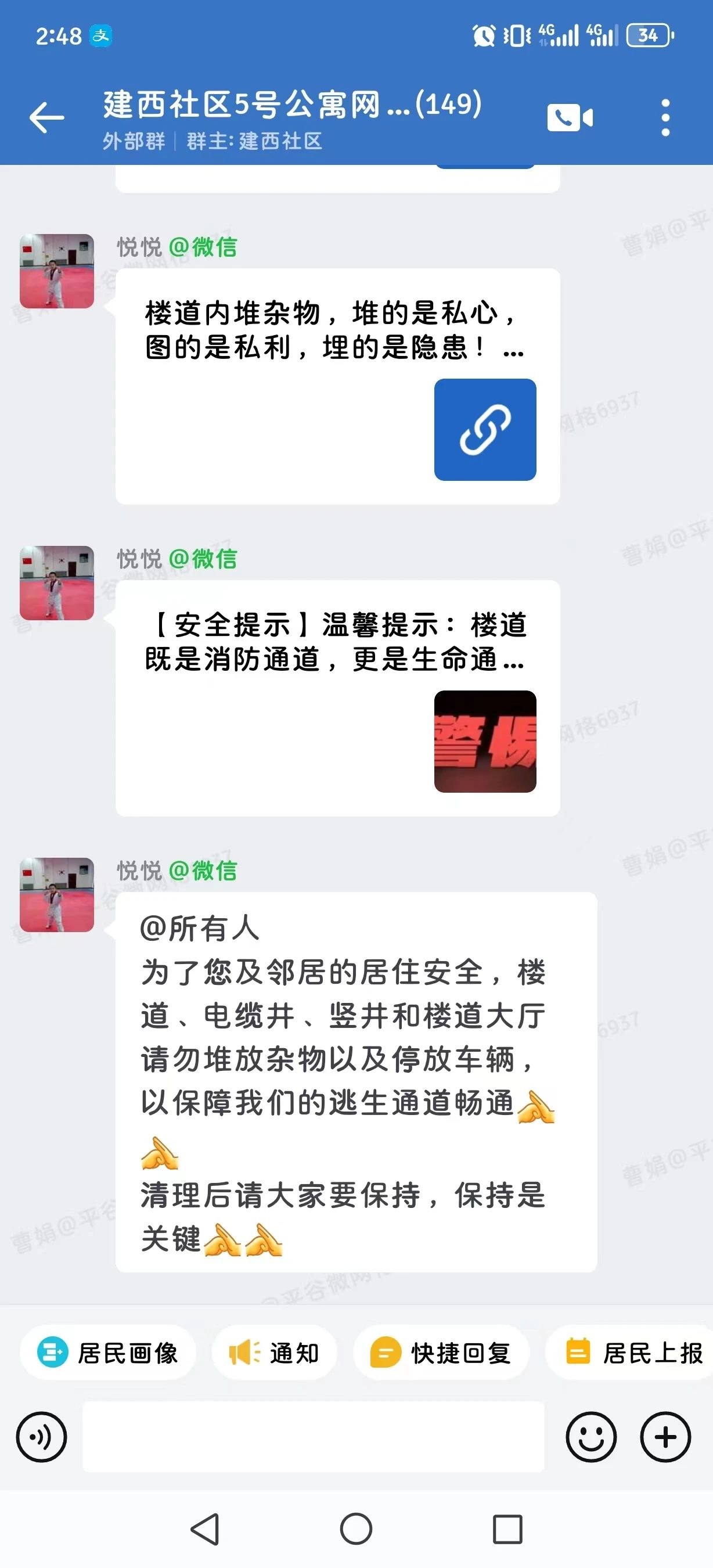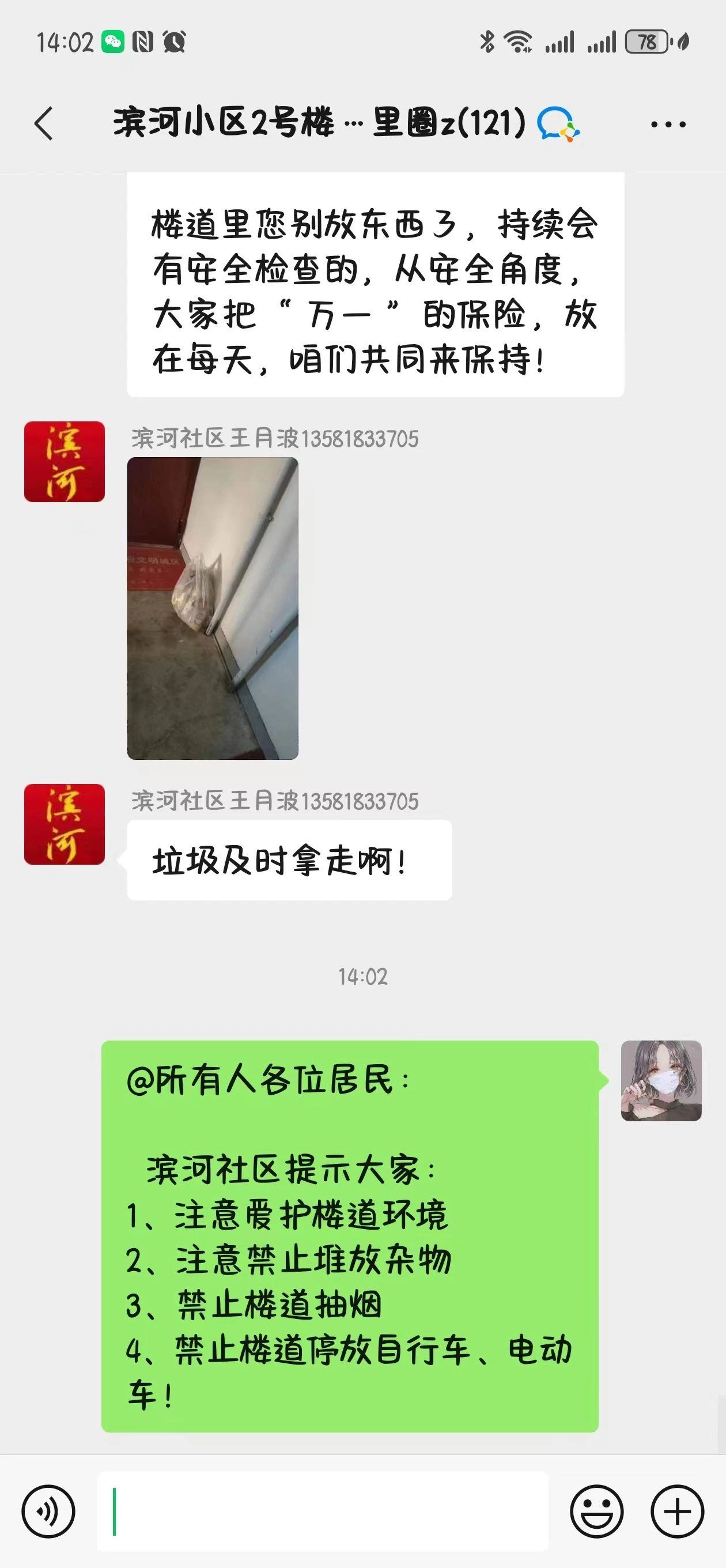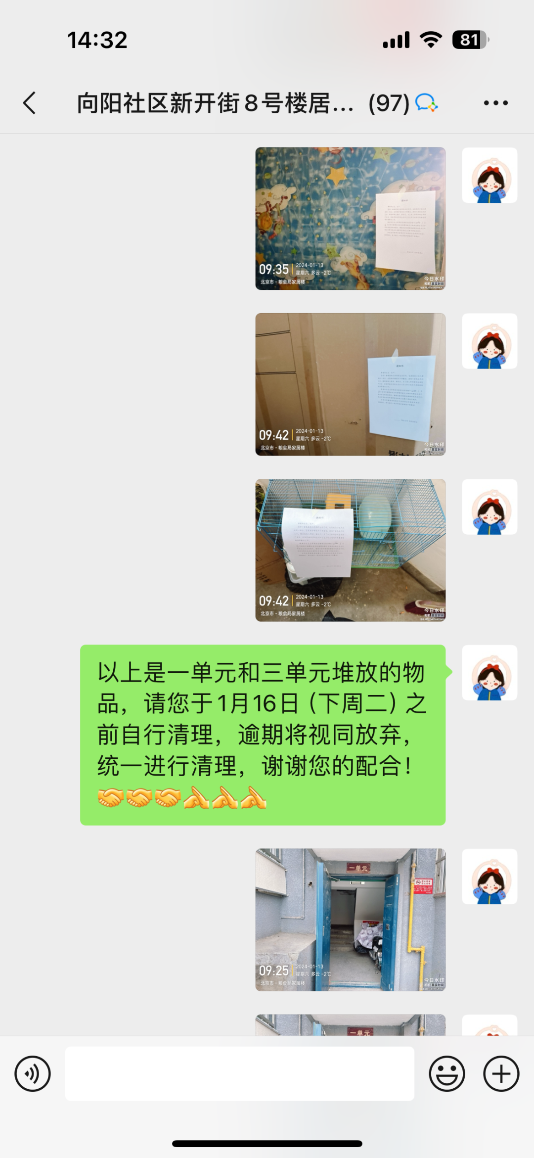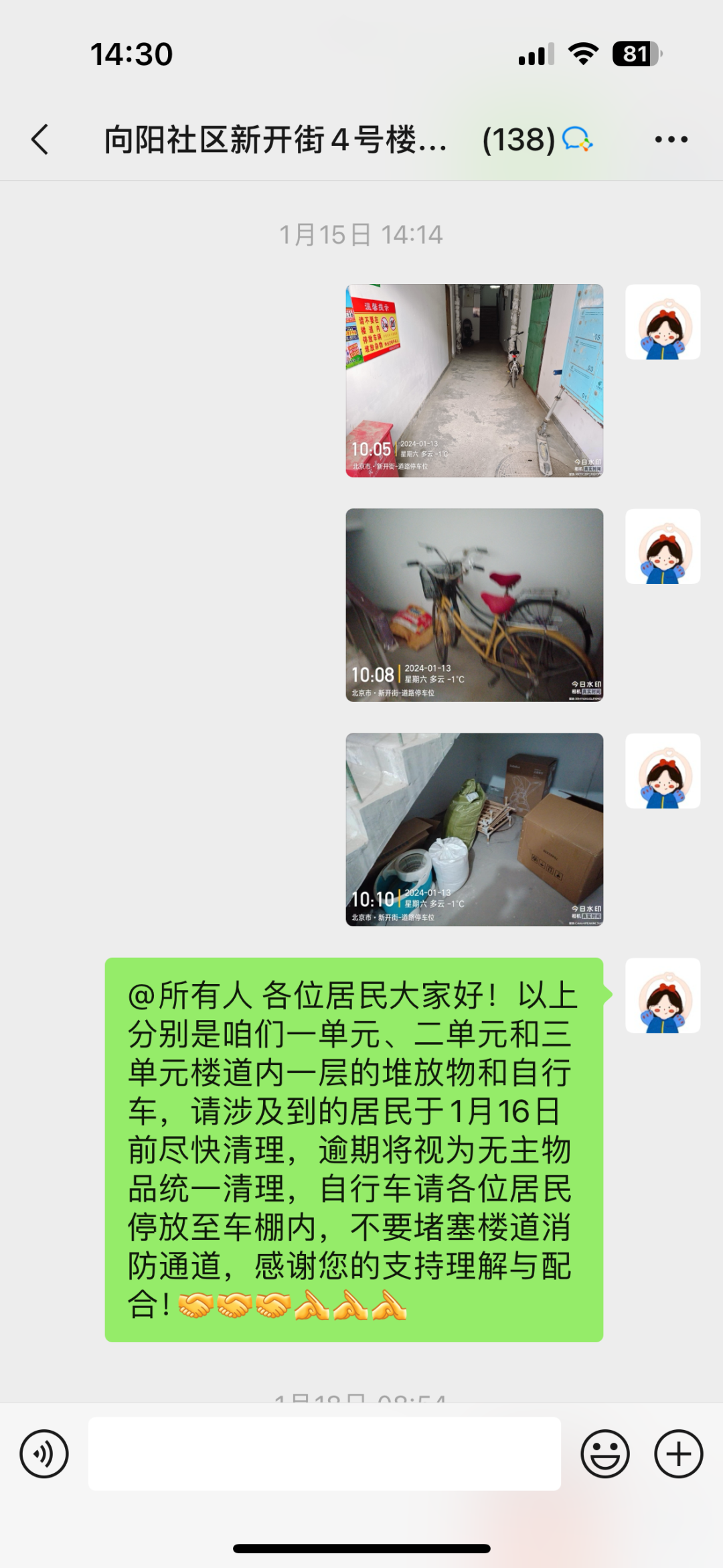 “清道行动”前,社区网格员和物业人员对小区进行摸排走访,重点检查公共区域乱堆乱放情况,建立整改台账,明确整改目标,张贴整改通知,通过张贴温馨提示和微信群告知等形式提醒居民自行清理楼道堆放物,针对无人认领的物品逐一电话询问,确保宣传到位,不落一户。