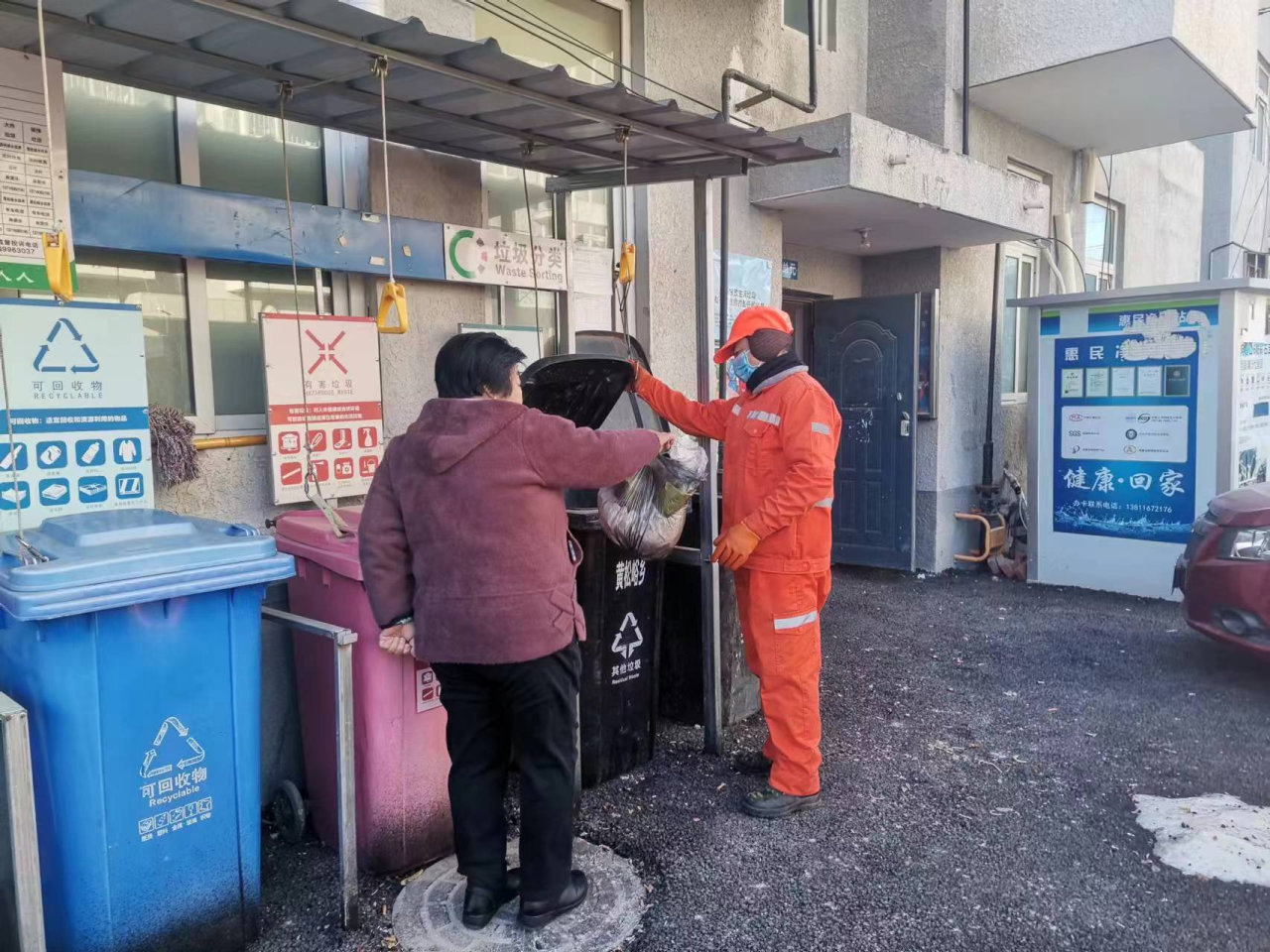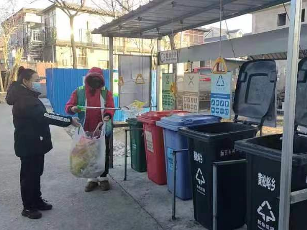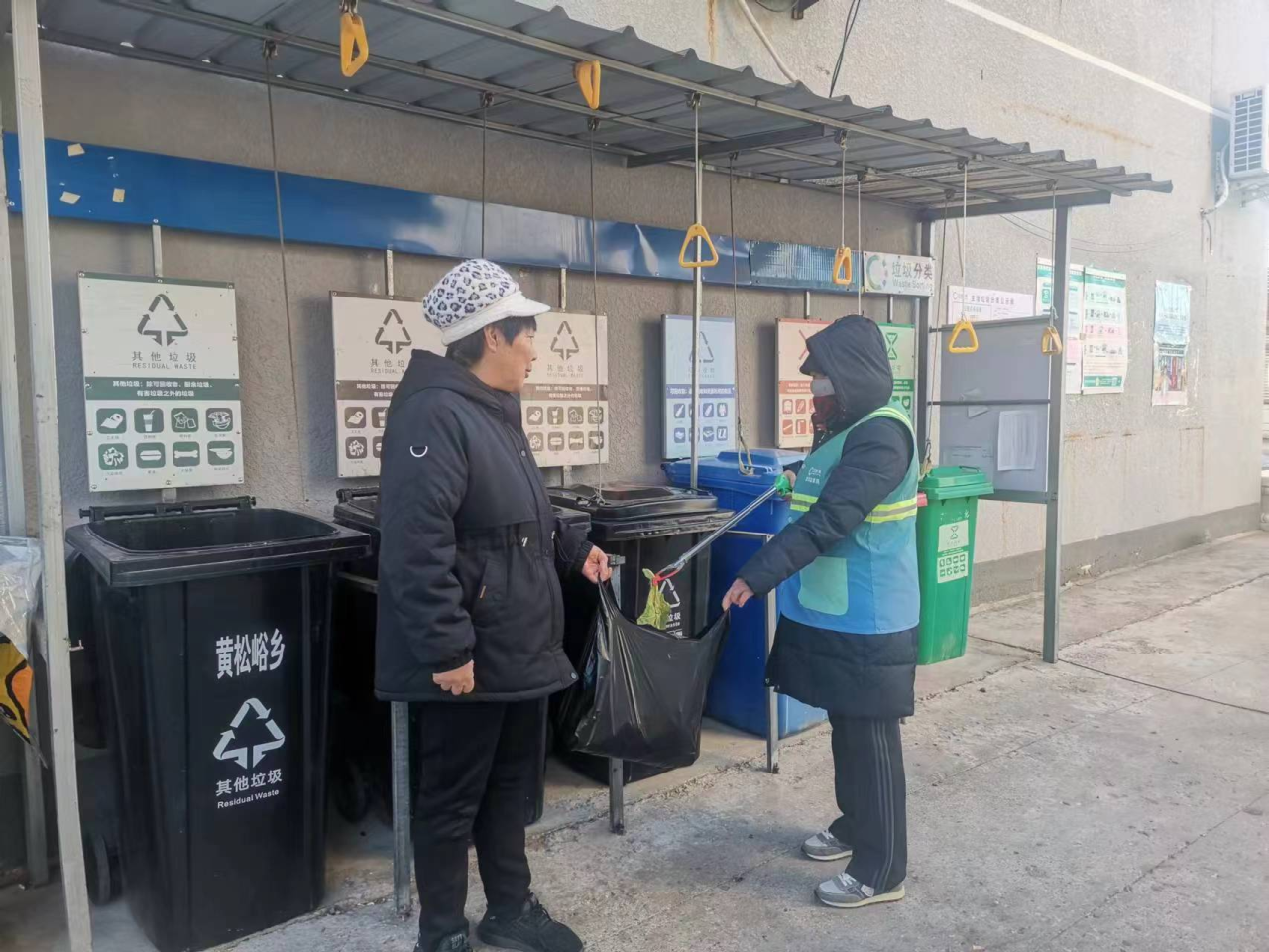 垃圾分类指导员每日坚持桶前值守,指导检查村民正确有序投放生活垃圾。