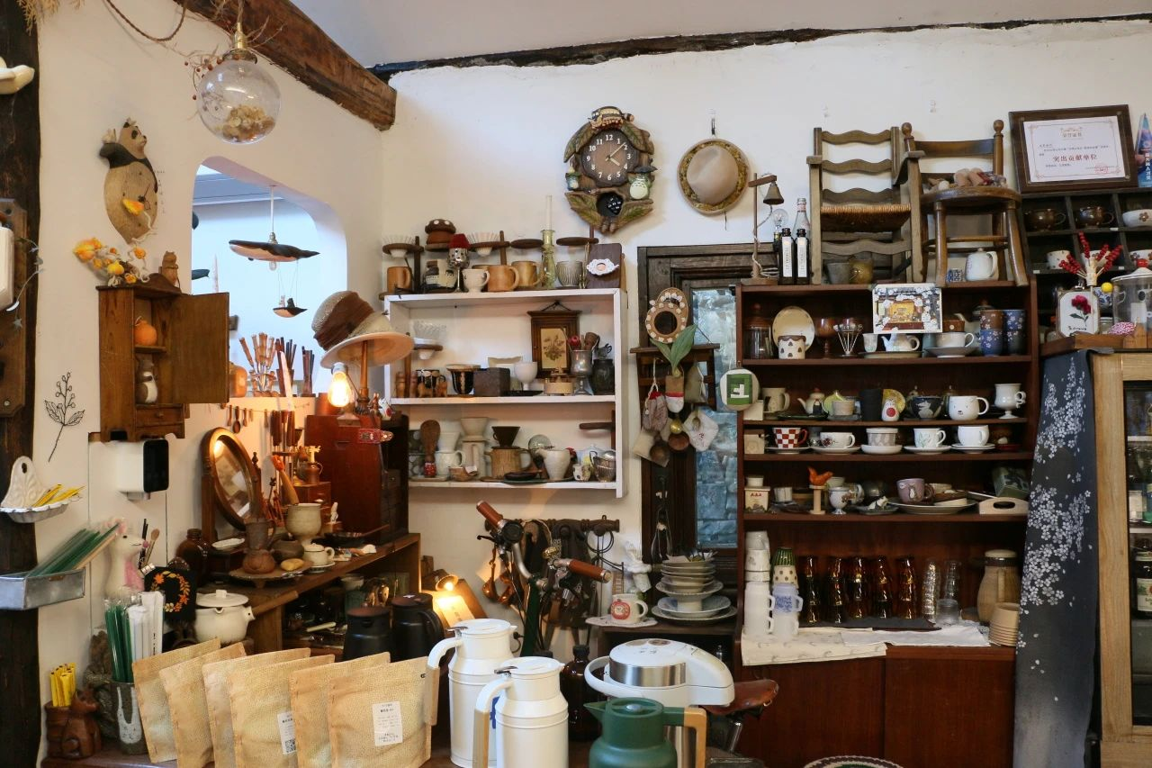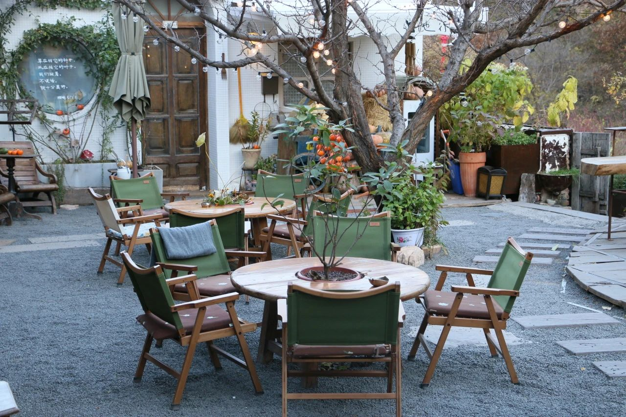 “也行”咖啡馆的外观古朴,原木门、石头围墙、修剪得当的花卉,都透着艺术气息。院中,碎石铺路,满地是随意落下的叶子,屋檐处自然垂落的茅草,已把店主的随性透露出来。虽然是平日,院子里依然坐满了赏景的客人,有的人在拍照、有的人手捧咖啡,在和朋友热聊,也有的人在敲电脑,时不时会抬眼瞧一瞧山色,像是在寻找灵感。推门进入,浓郁的咖啡香与木质香迎面而来,轻柔的音乐,更容易让人沉迷在这个午后。