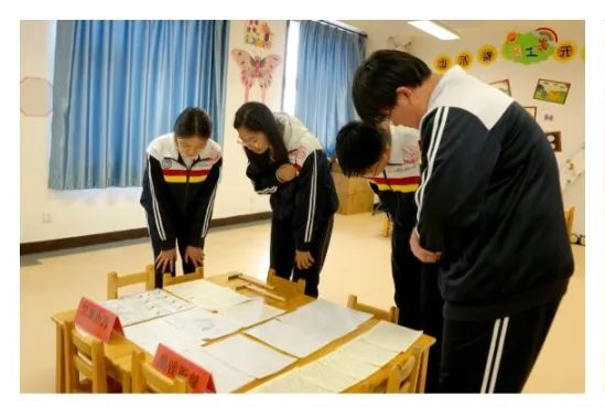 同学们驻足欣赏各具特色的优秀作业,眼神专注的神情、不时地相互交流探讨,表达对作品的喜爱与赞美。