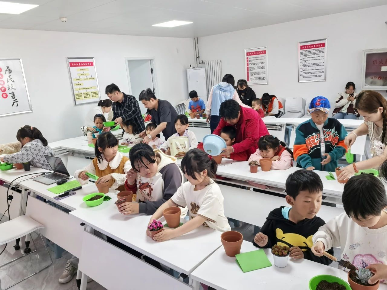 活动伊始,园艺师李老师通过趣味 PPT 讲解多肉植物的特性:“多肉是‘懒人植物’,叶片储存水分的能力超强,就像一个个小水库。”孩子们目不转睛地观察展示台上的虹之玉、熊童子、佛珠吊兰等品种,纷纷举手提问:“为什么有的多肉像小熊爪子?”“它们会开花吗?”李老师用通俗易懂的语言解答,还分享了 “浇水三原则”——“干透浇透、避免积水、沿盆边浇”,让家长和孩子们掌握养护要点。在“多肉 DIY”环节,25组亲子家庭在志愿者的指导下体验多肉种植。孩子们先在花盆里铺土,再小心翼翼地将多肉植入花盆,填土固定植物,最后用石子铺表面,不时传来“小心别弄伤根系”“摆件位置再调整一下”的温馨提醒。