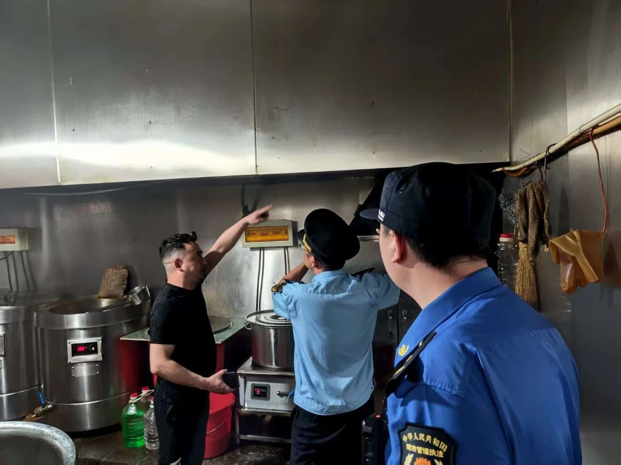 此次行动对1家未安装油烟净化装置的商户开具整改单,督促3家餐饮小吃店铺及时清理排烟管道油污。