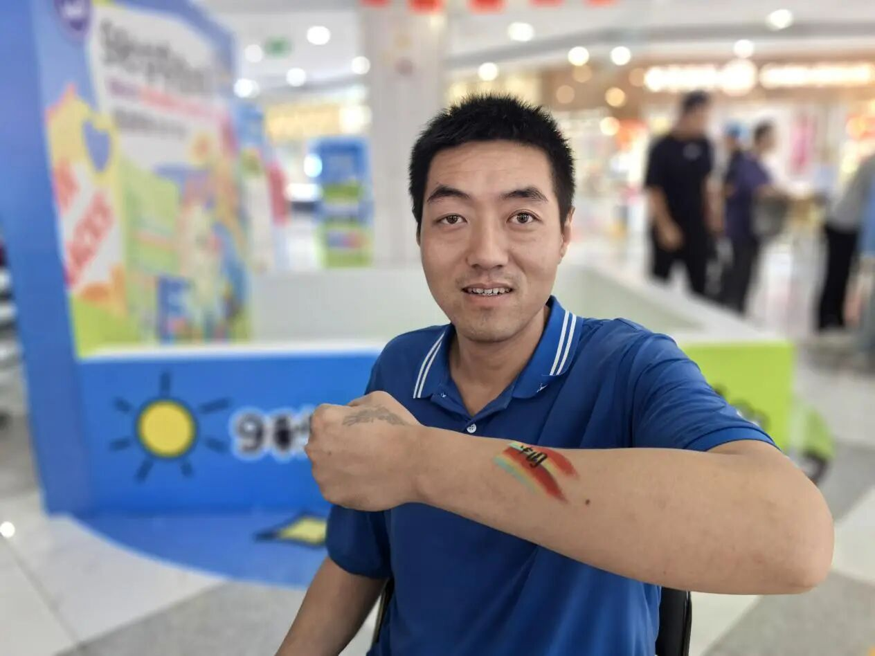 在面部彩绘区,专业彩绘师精心设计了融合国庆与中秋元素的图案。除了“中国梦”主题彩绘,不少参与者还选择了象征团圆的玉兔、明月等造型。一位美团骑手高兴地展示手臂上的五星红旗彩绘,“这个活动特别有意思,平时忙着跑单,今天也体验了一把不一样的节日氛围。”