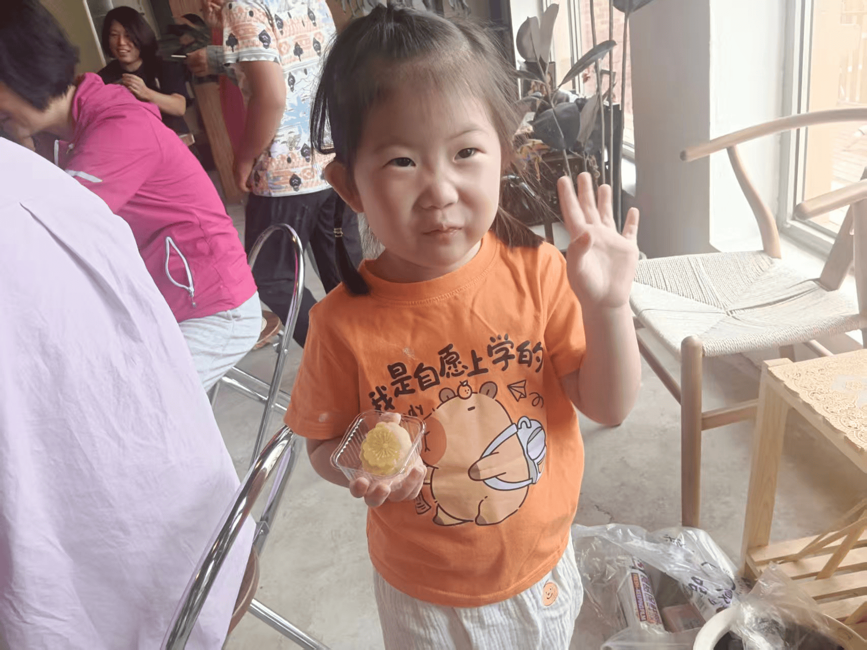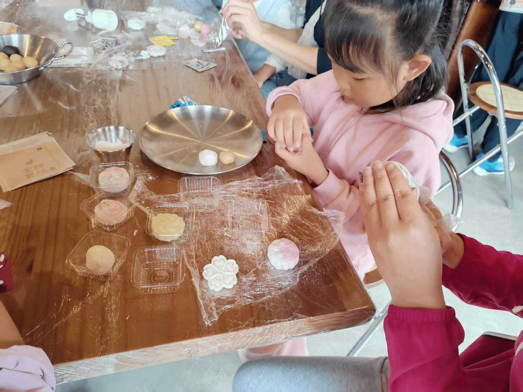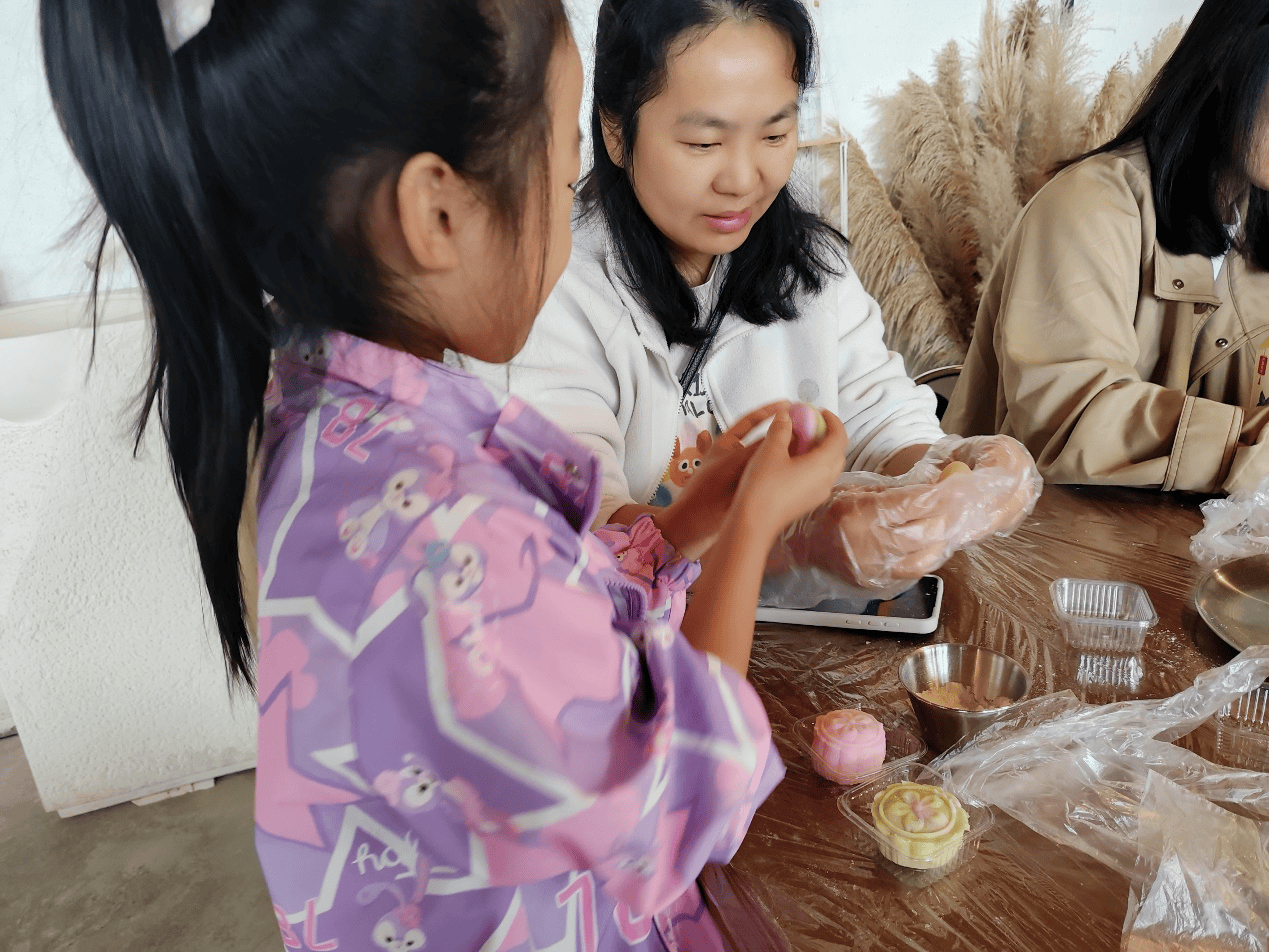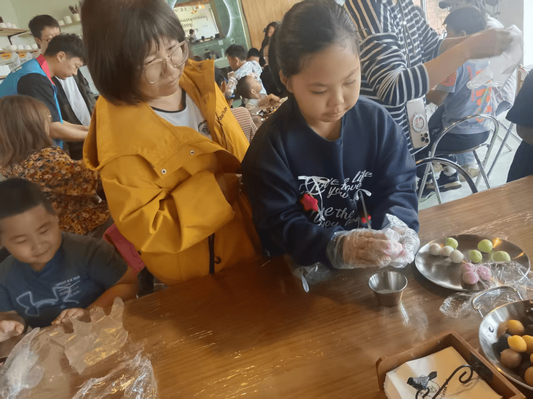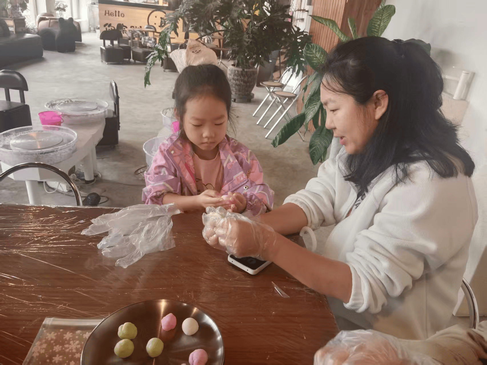 制作环节开启,活动室气氛达到高潮。家长和孩子们一起和粉、搓团、包馅,配合默契。一个个晶莹剔透、纹路清晰的冰皮月饼在手中诞生,孩子们看到成品时兴奋地举起来展示,脸上洋溢着纯真的笑容。大家互相交流制作心得,不时传来阵阵笑声,节日的喜悦在空气中弥漫开来。