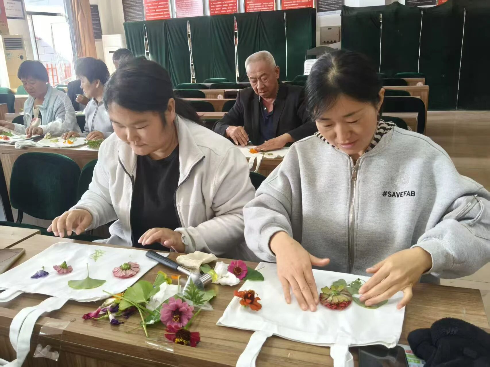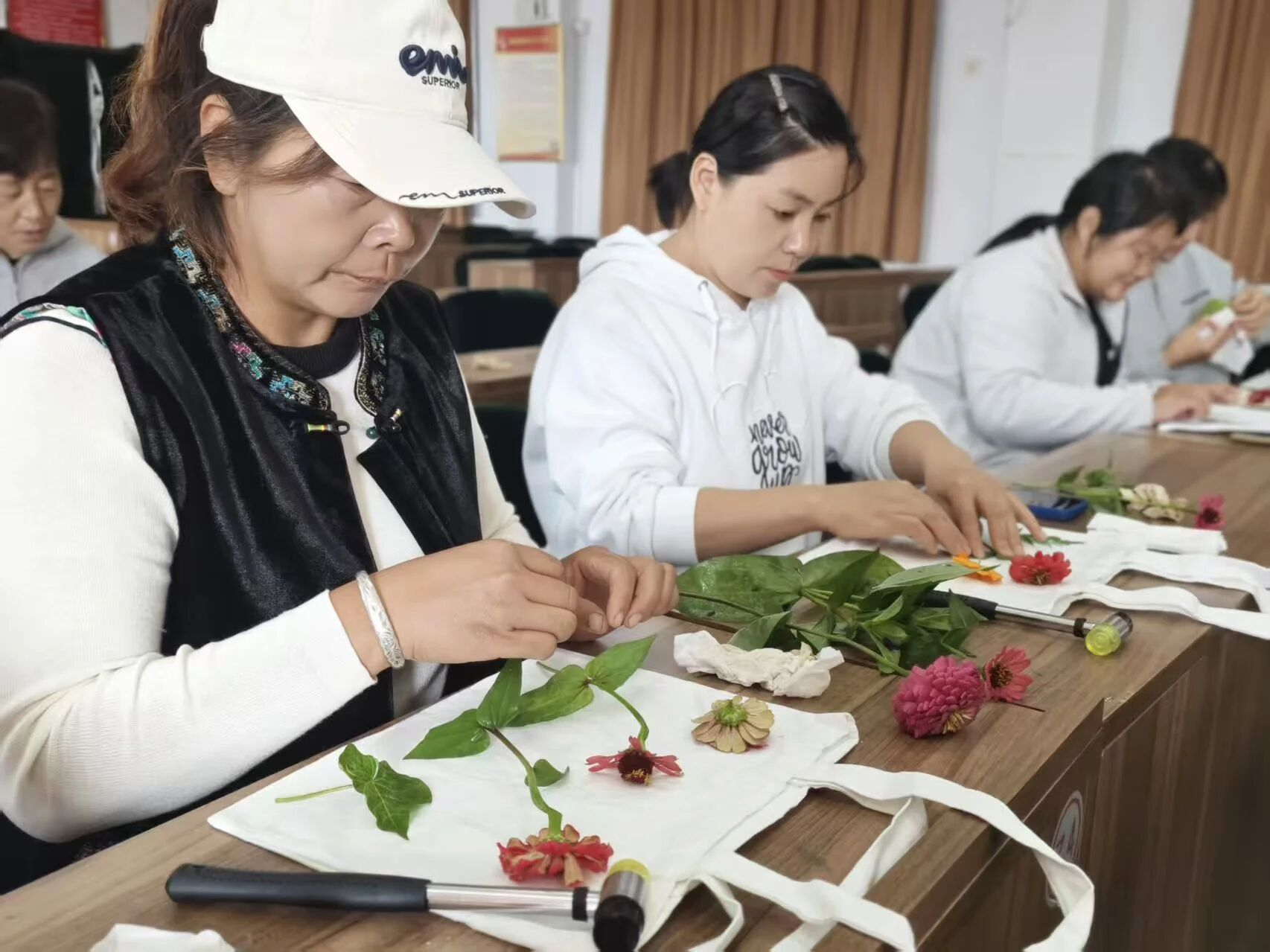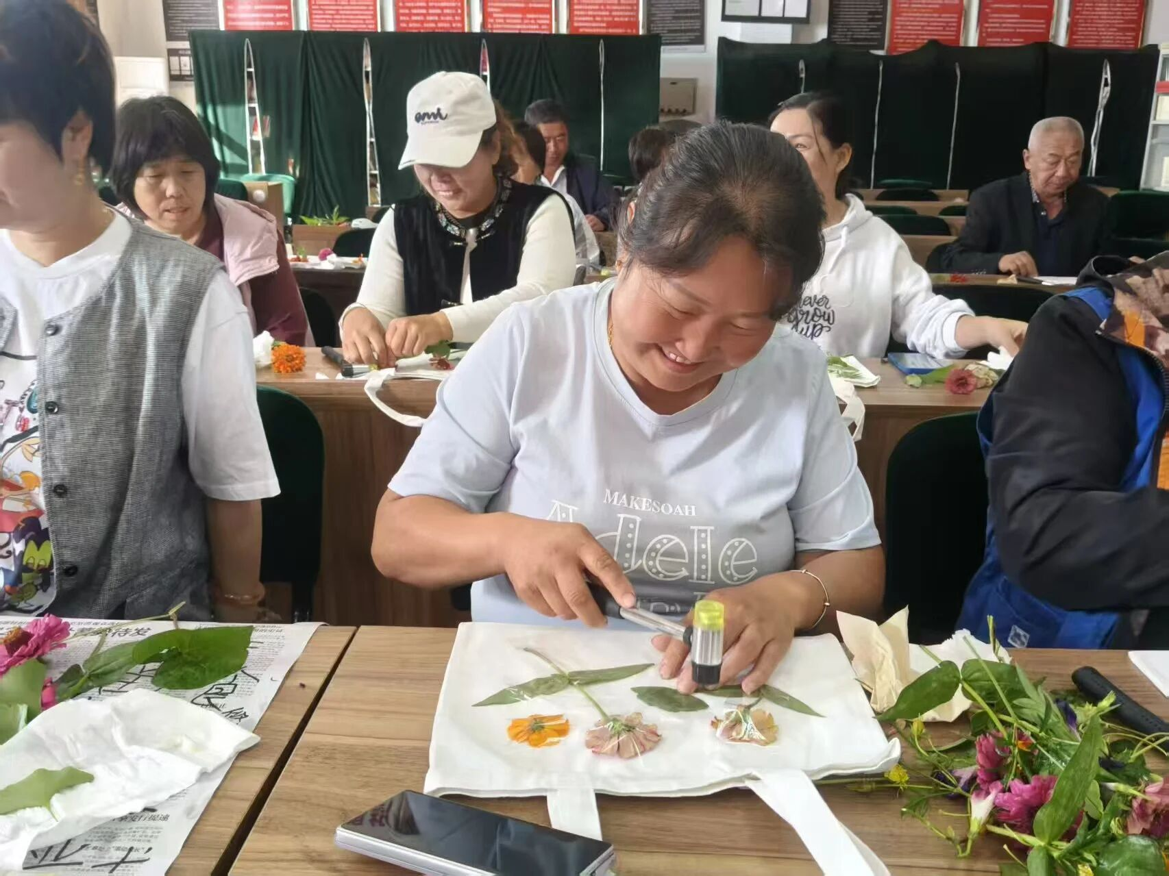 在老师的耐心指导下,学员们跃跃欲试,挑选着自己心仪的图案模板,调配出缤纷的色彩。“轻轻拿稳木锤,顺着叶片边缘慢慢敲,别着急,纹理会慢慢显出来的。”在老师的指导下,学员们纷纷拿起工具,按压、上色、拓印,每一个步骤都凝聚着大家的巧思与专注。有人将金盏菊层层叠放,敲打出圆满的圆形,暗合中秋“月圆人团圆”的美好寓意;有的印上了寓意美好的传统纹样,有的创作出清新雅致的花草图案,还有的发挥想象,设计出独具个性的创意作品。
