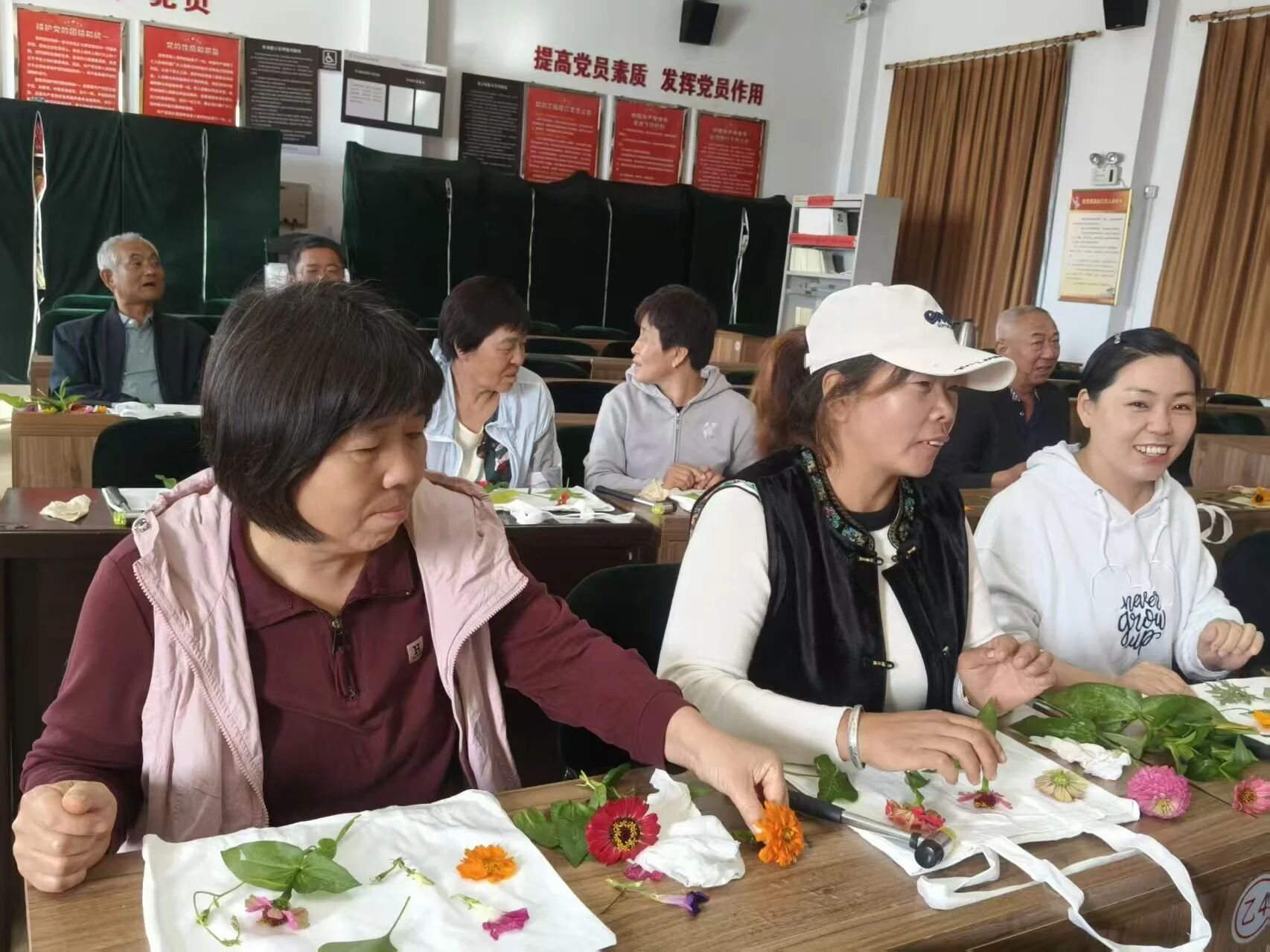 活动现场,空气中弥漫着草木的清新与节日的喜悦。培训老师首先为大家讲解了拓印的历史渊源和制作技巧,将准备好的金盏菊、枫叶、紫苏叶等新鲜素材摆放整齐,从植物选择的窍门,到捶打力度的把控,再到色彩晕染的技巧,每一个细节都讲解得细致入微,让学员们快速掌握拓染的核心要领。
