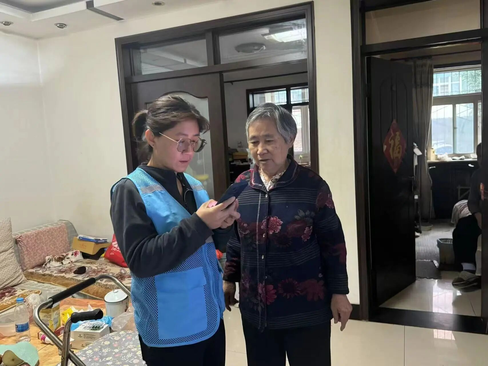 互助养老从不是 “一时热闹”,而是峪口村长长久久的 “日常守护”。村里专门建立了 “每周定期走访+按需即时响应” 的服务机制,让温暖从不缺席。以网格员高娅贤为代表的工作人员,更是把老人的事当成自己的事。她常往高龄老人家里跑,不仅解决手机、电视、电动车等生活小难题,一句挂在嘴边的“有事儿您就给我打电话”更在细微处传递温暖,一面锦旗就是对她尽职尽责、无私奉献的最好诠释。